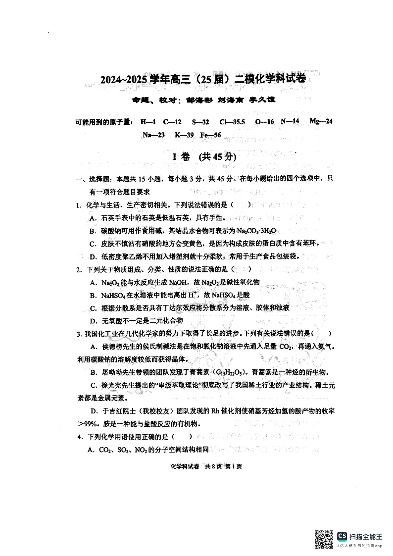 辽宁省鞍山市第一中学2025届高三上学期10月二模 化学