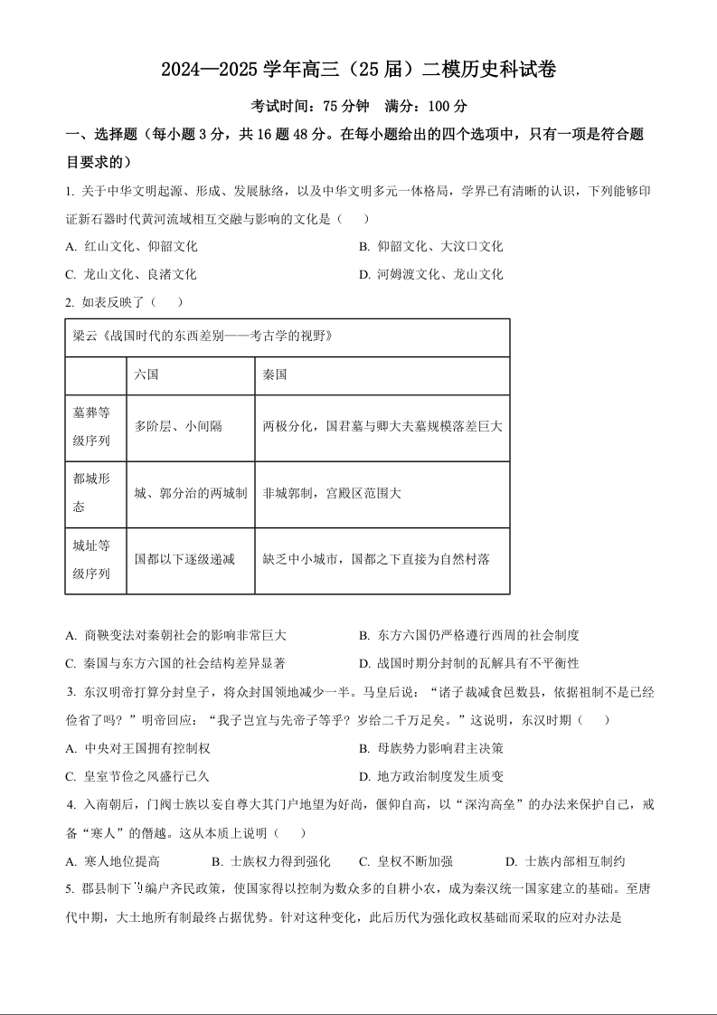 辽宁省鞍山市第一中学2025届高三上学期10月二模 历史