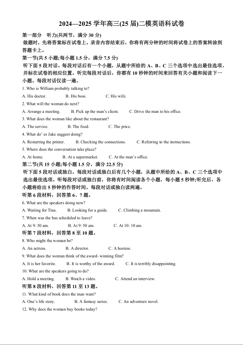 辽宁省鞍山市第一中学2025届高三上学期10月二模 英语