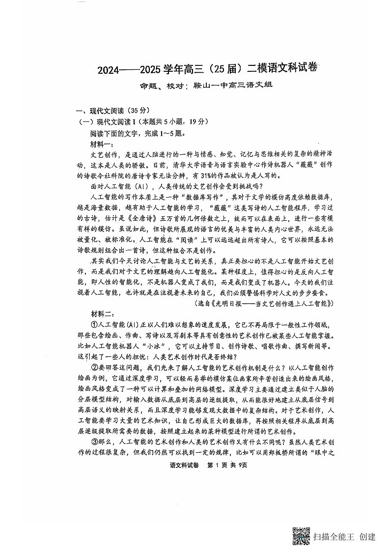 辽宁省鞍山市第一中学2025届高三上学期10月二模 语文