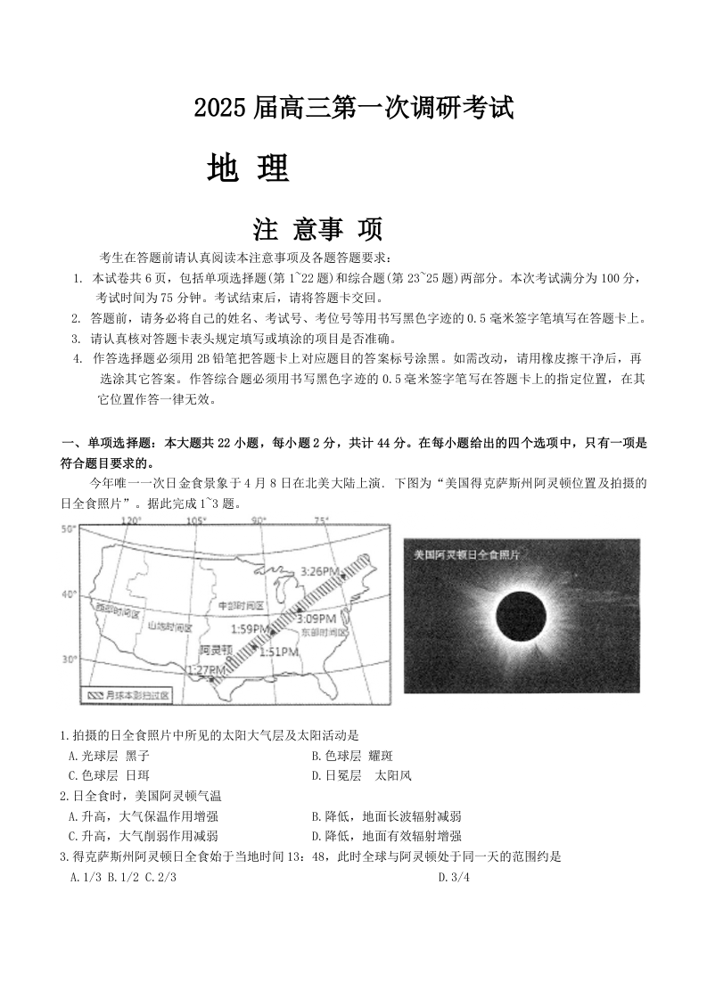 南通海门中学2025届高三上学期第一次调研考试 地理