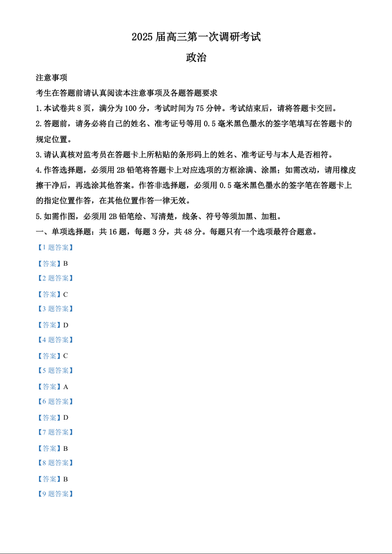 南通海门中学2025届高三上学期第一次调研考试 政治答案