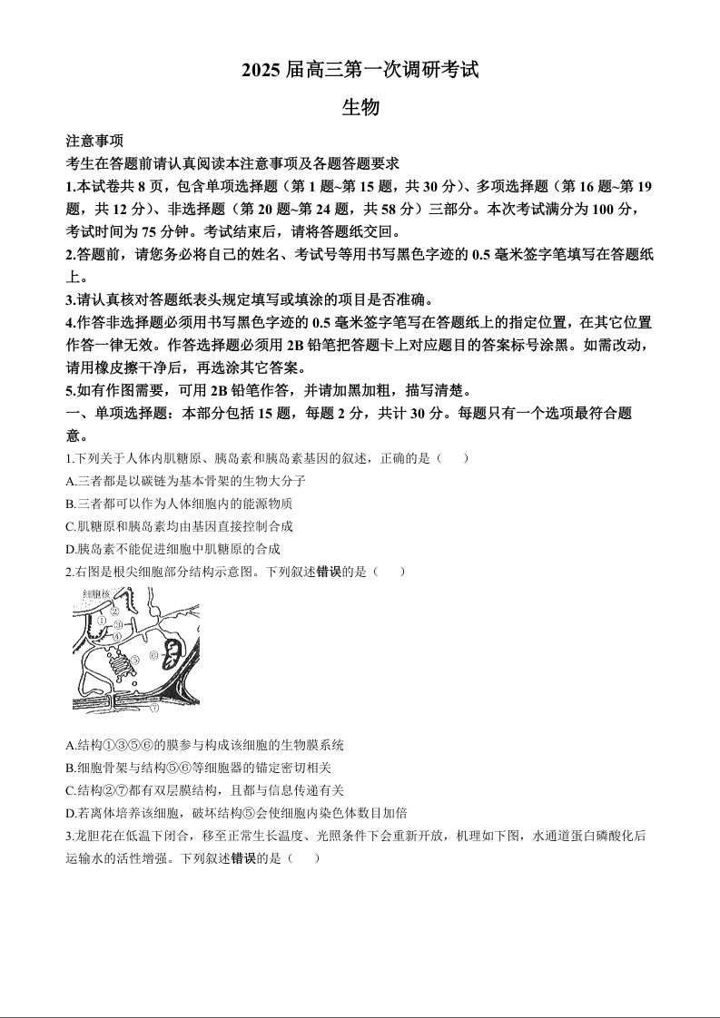 南通海门中学2025届高三上学期第一次调研考试 生物