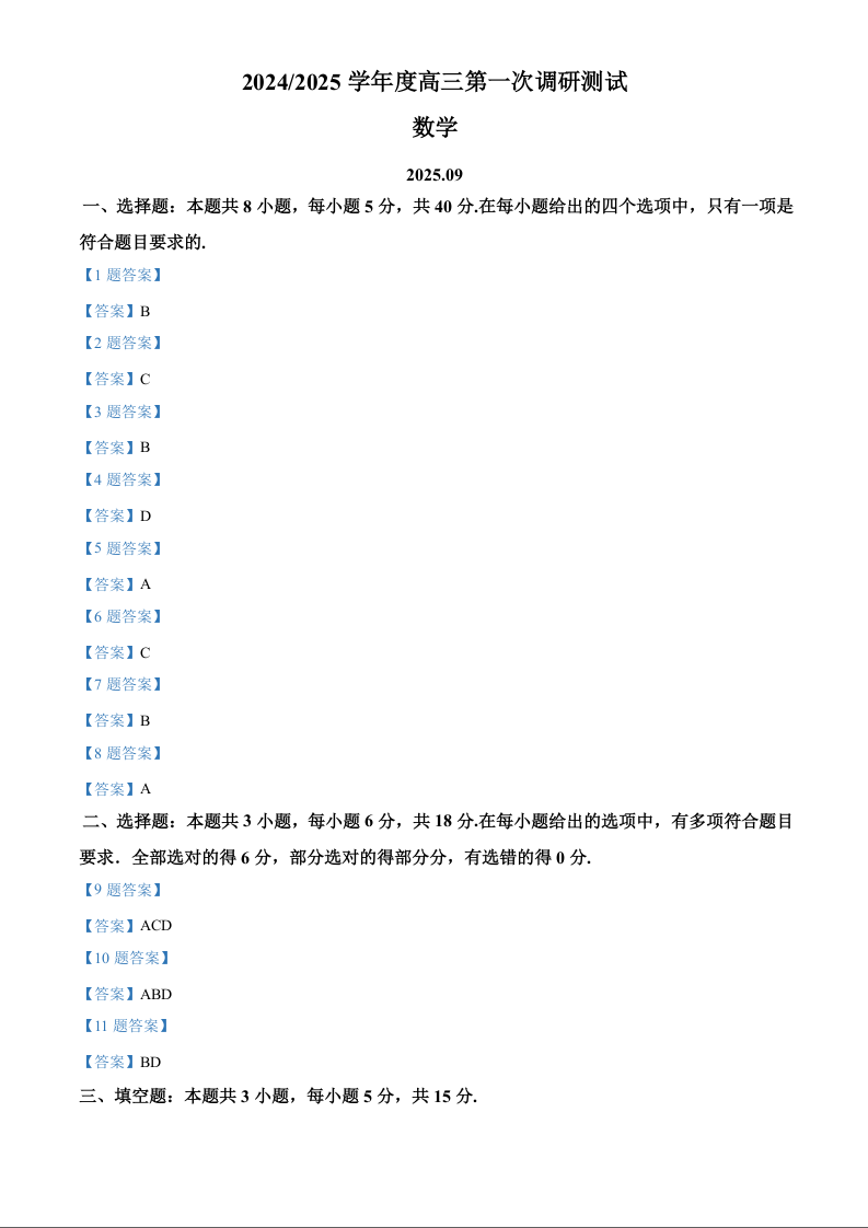 南通海门中学2025届高三上学期第一次调研考试 数学答案
