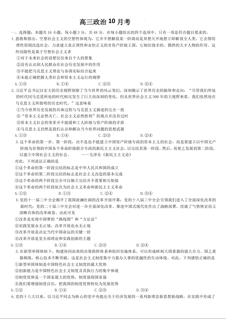 吉林省通化市梅河口市第五中学2025届高三上学期10月月考 政治