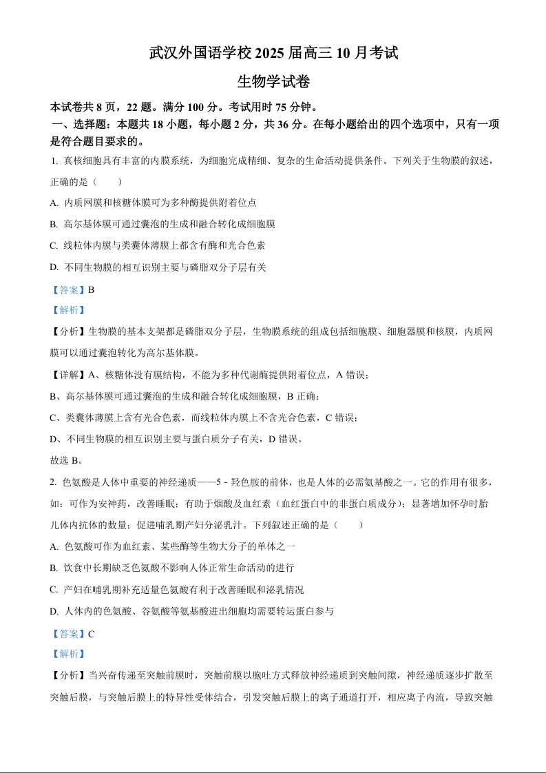 武汉外国语学校2024-2025学年度上学期10月阶段性诊断考试 生物答案