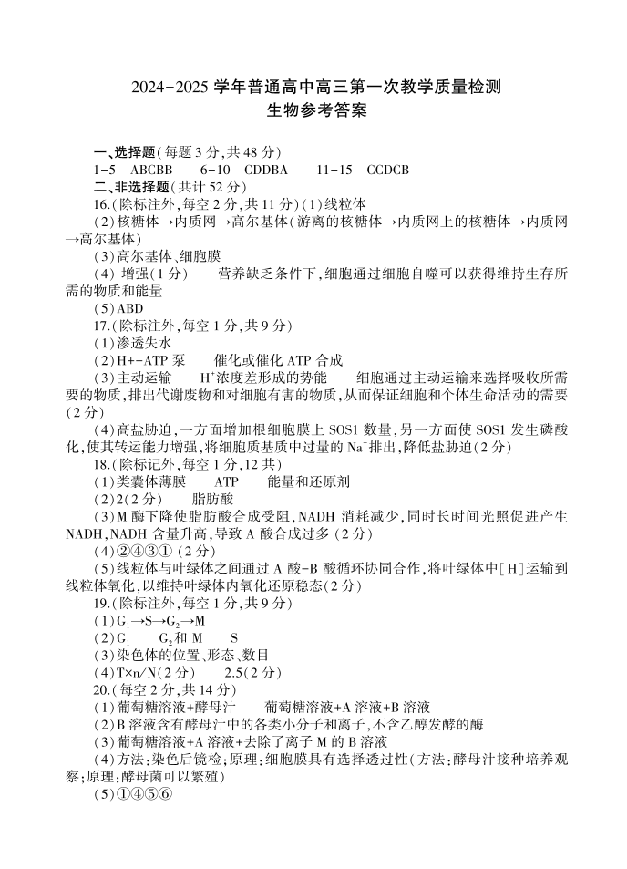 河南省信阳市2024-2025学年普通高中高三第一次教学教学质量检测 生物答案