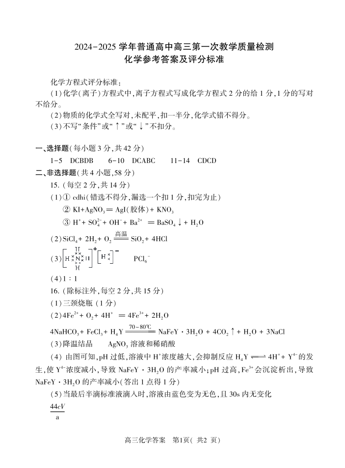 河南省信阳市2024-2025学年普通高中高三第一次教学教学质量检测 化学答案