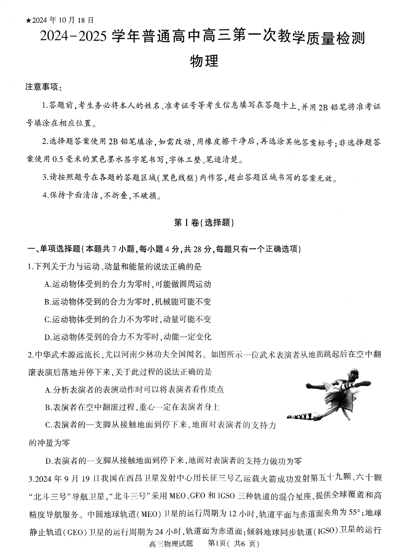 河南省信阳市2024-2025学年普通高中高三第一次教学教学质量检测 物理