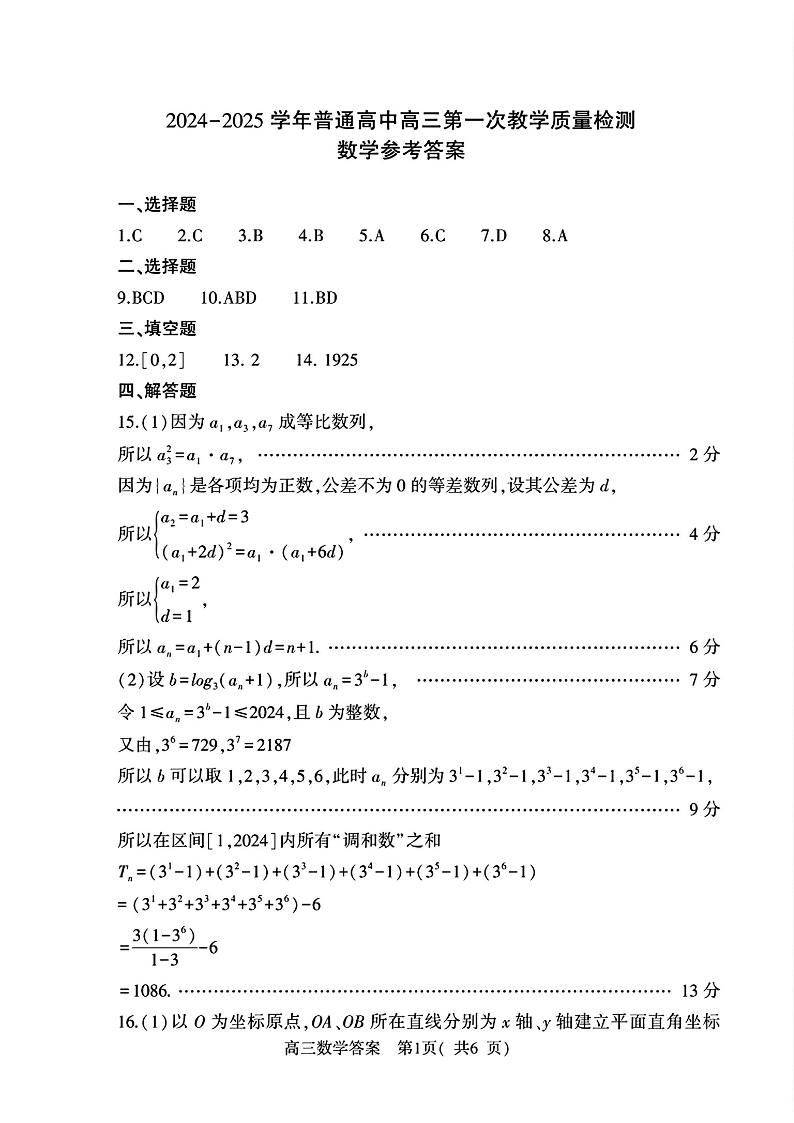 河南省信阳市2024-2025学年普通高中高三第一次教学教学质量检测 数学答案