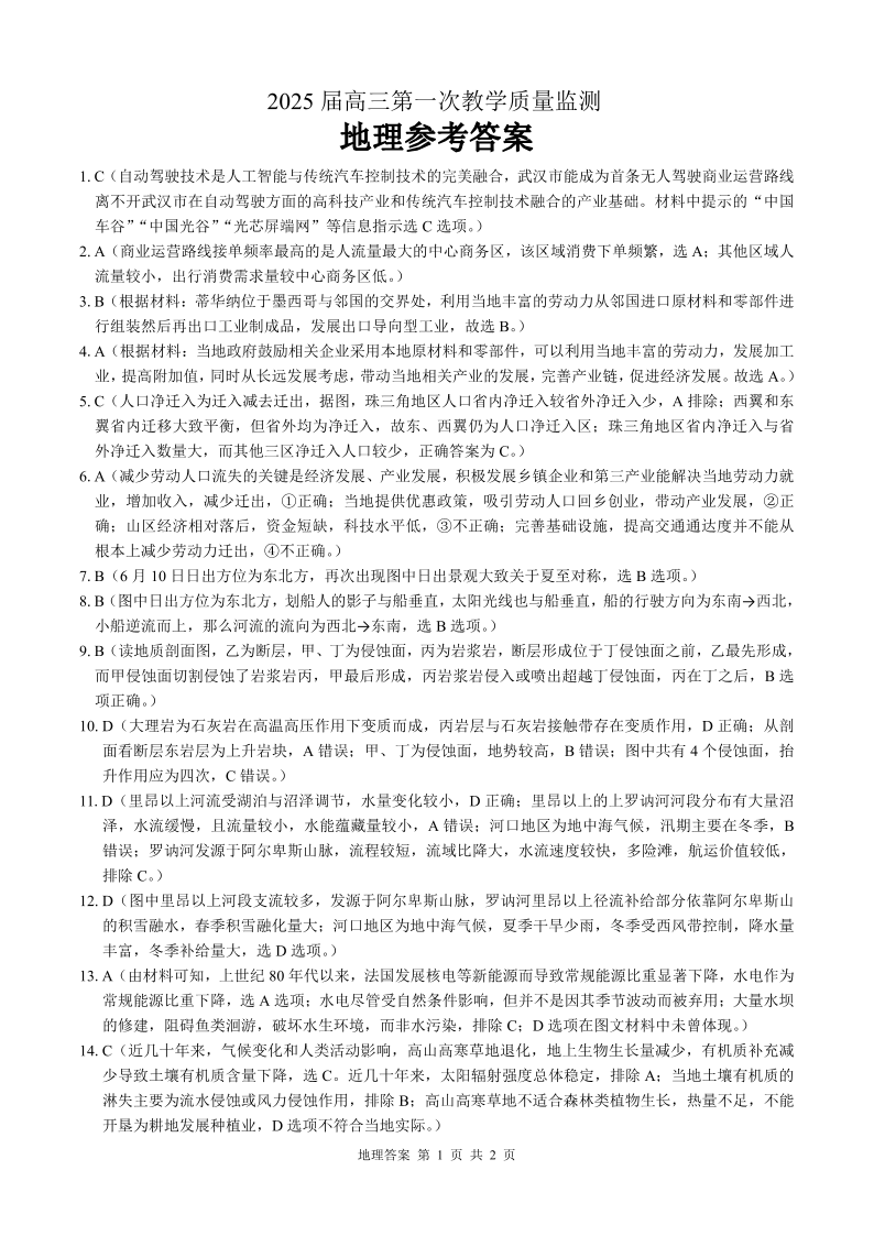 广西省玉林市2025届高三上学期第一次教学质量监测 地理答案