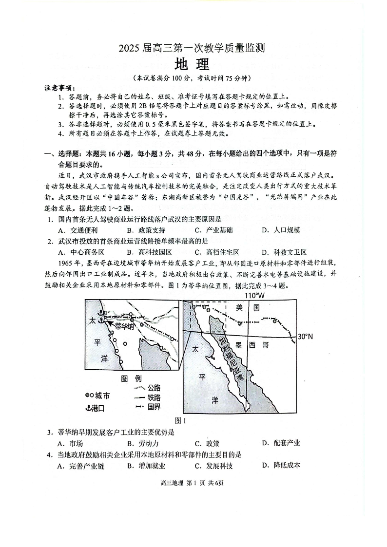 广西省玉林市2025届高三上学期第一次教学质量监测 地理