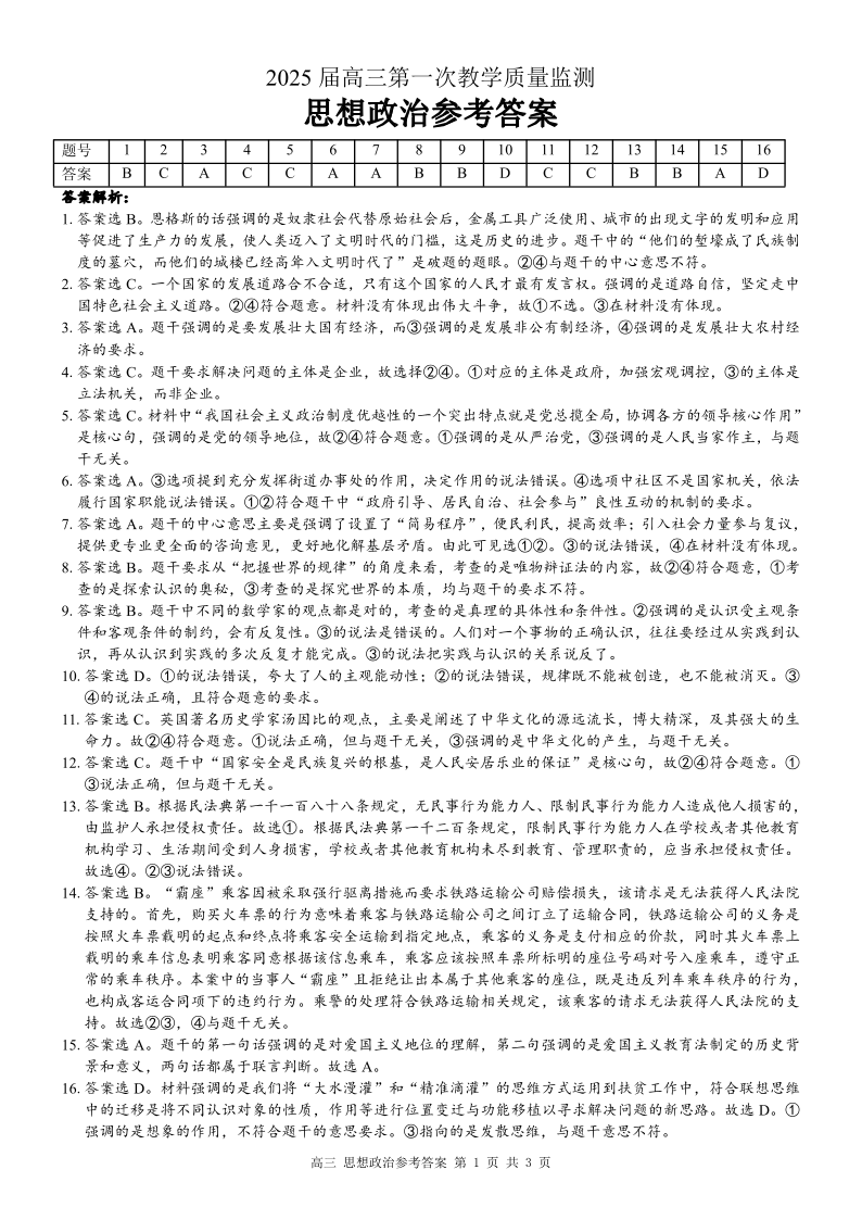 广西省玉林市2025届高三上学期第一次教学质量监测 政治答案