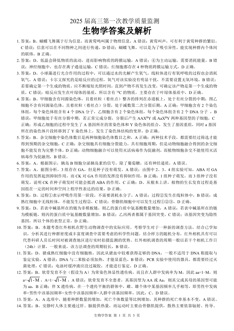 广西省玉林市2025届高三上学期第一次教学质量监测 生物答案