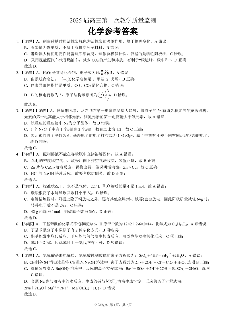 广西省玉林市2025届高三上学期第一次教学质量监测 化学答案