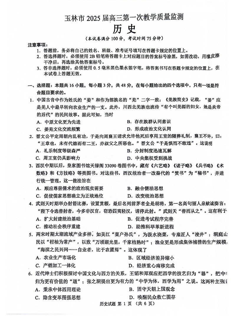 广西省玉林市2025届高三上学期第一次教学质量监测 历史