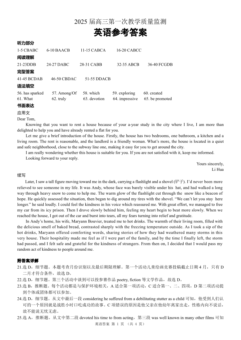 广西省玉林市2025届高三上学期第一次教学质量监测 英语答案