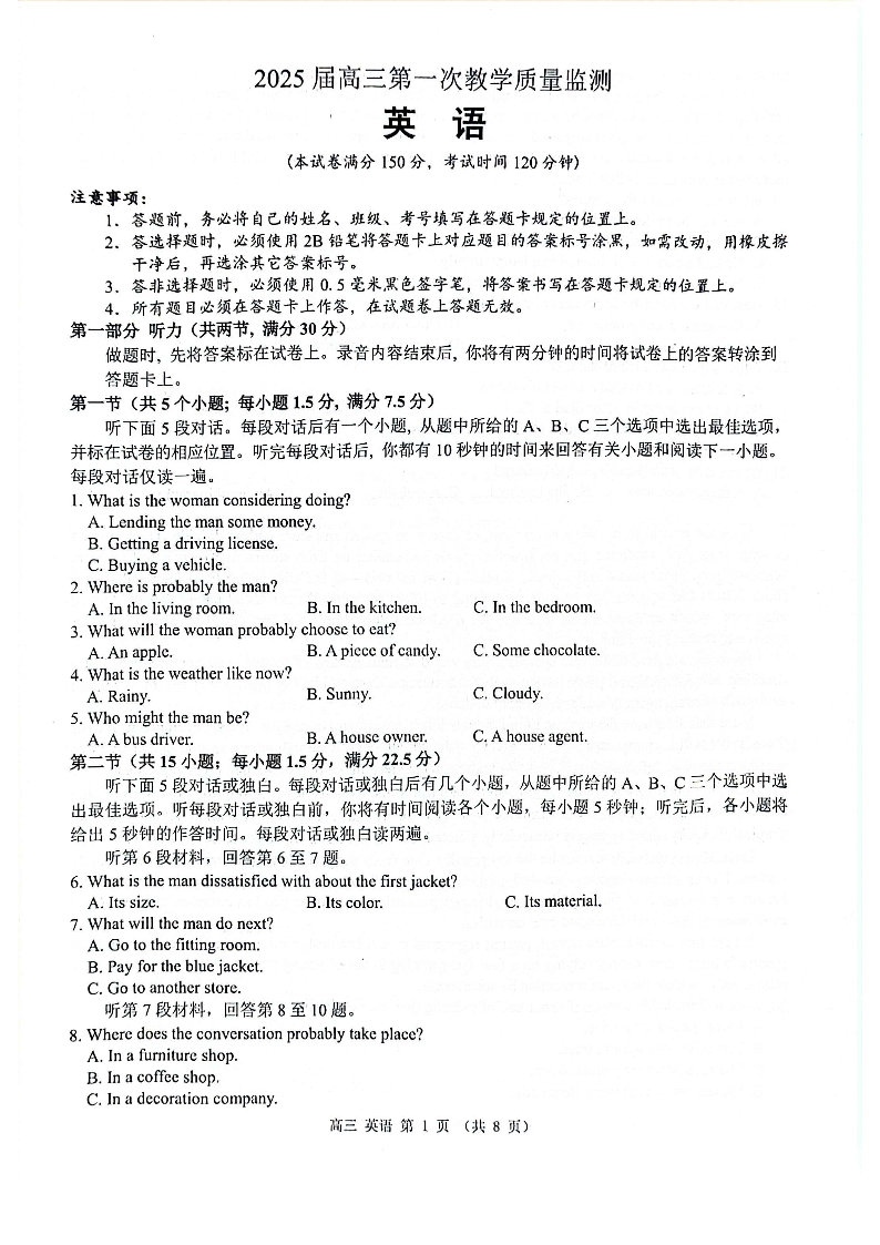 广西省玉林市2025届高三上学期第一次教学质量监测 英语