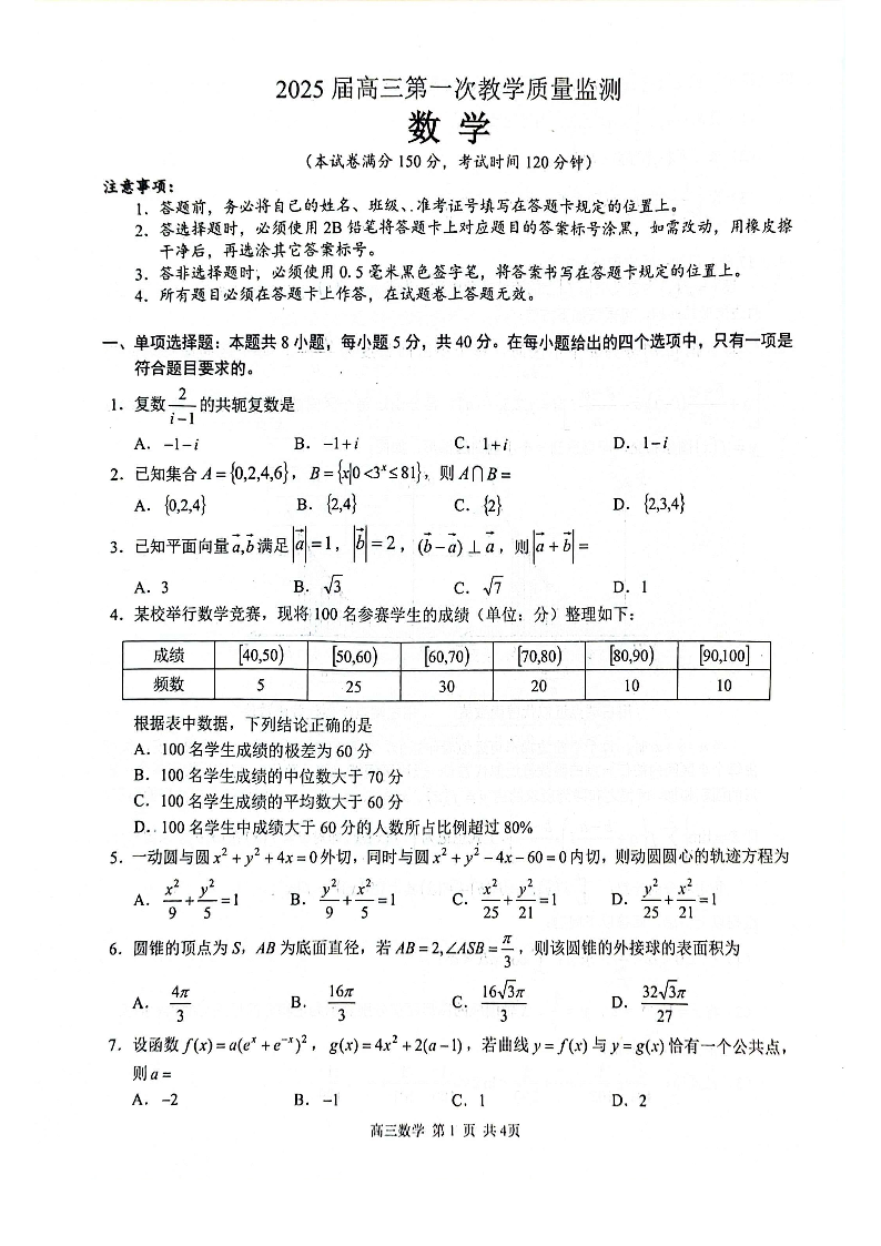 广西省玉林市2025届高三上学期第一次教学质量监测 数学