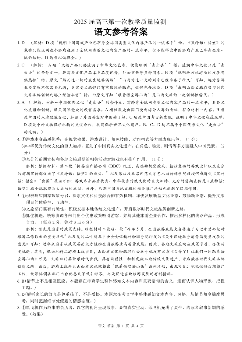 广西省玉林市2025届高三上学期第一次教学质量监测 语文答案