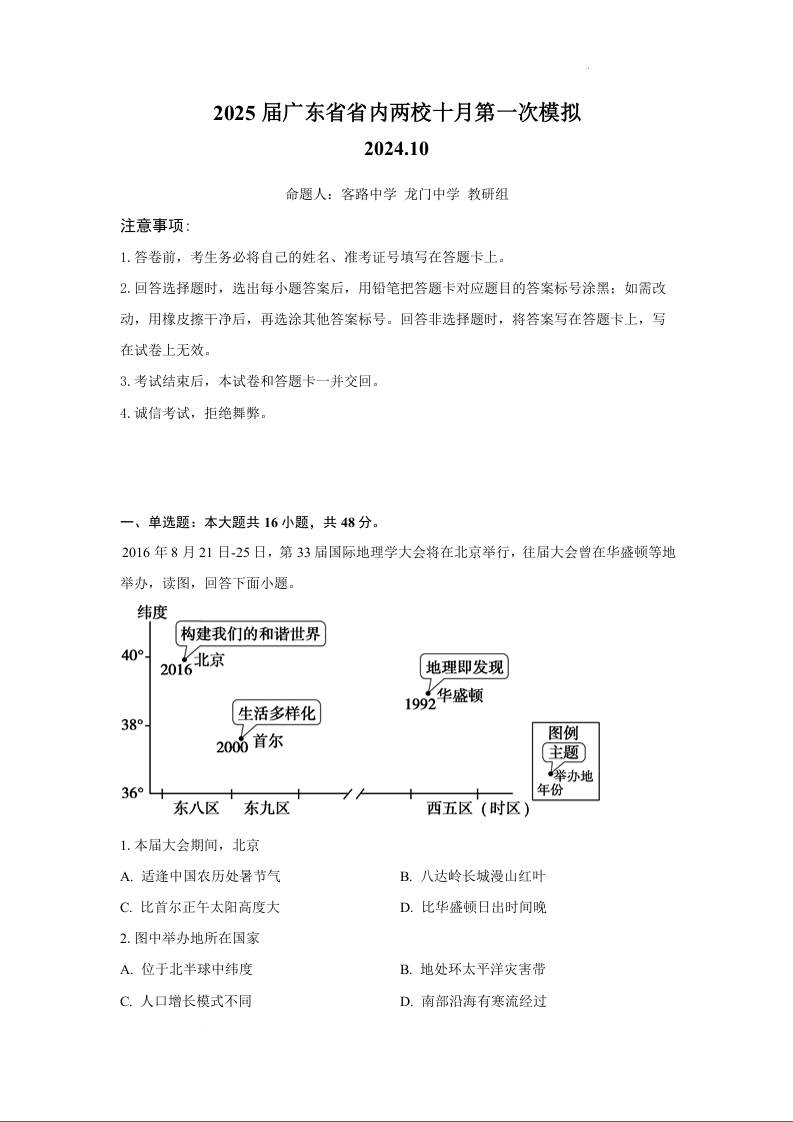 2025届广东省联考高三上学期10月第一次模拟(一模)地理