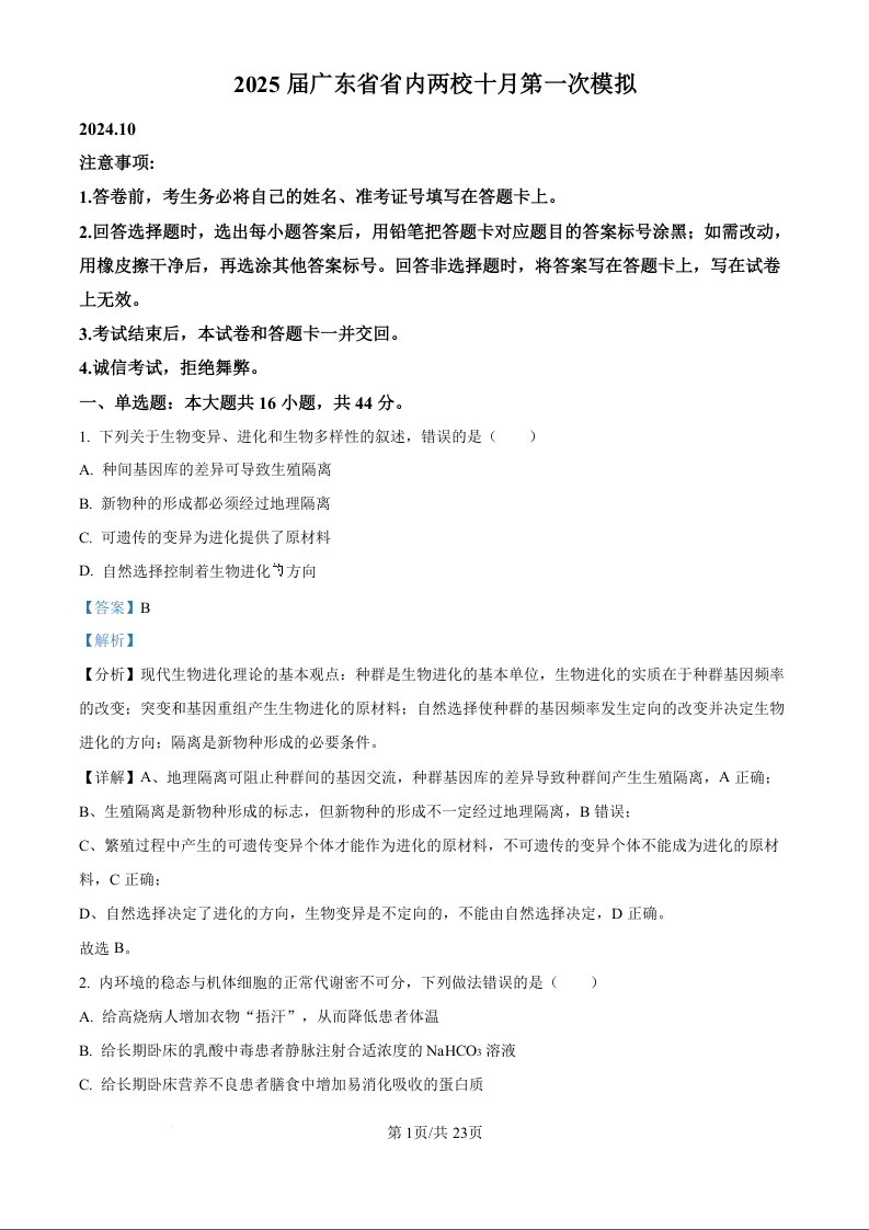 2025届广东省联考高三上学期10月第一次模拟(一模)生物答案