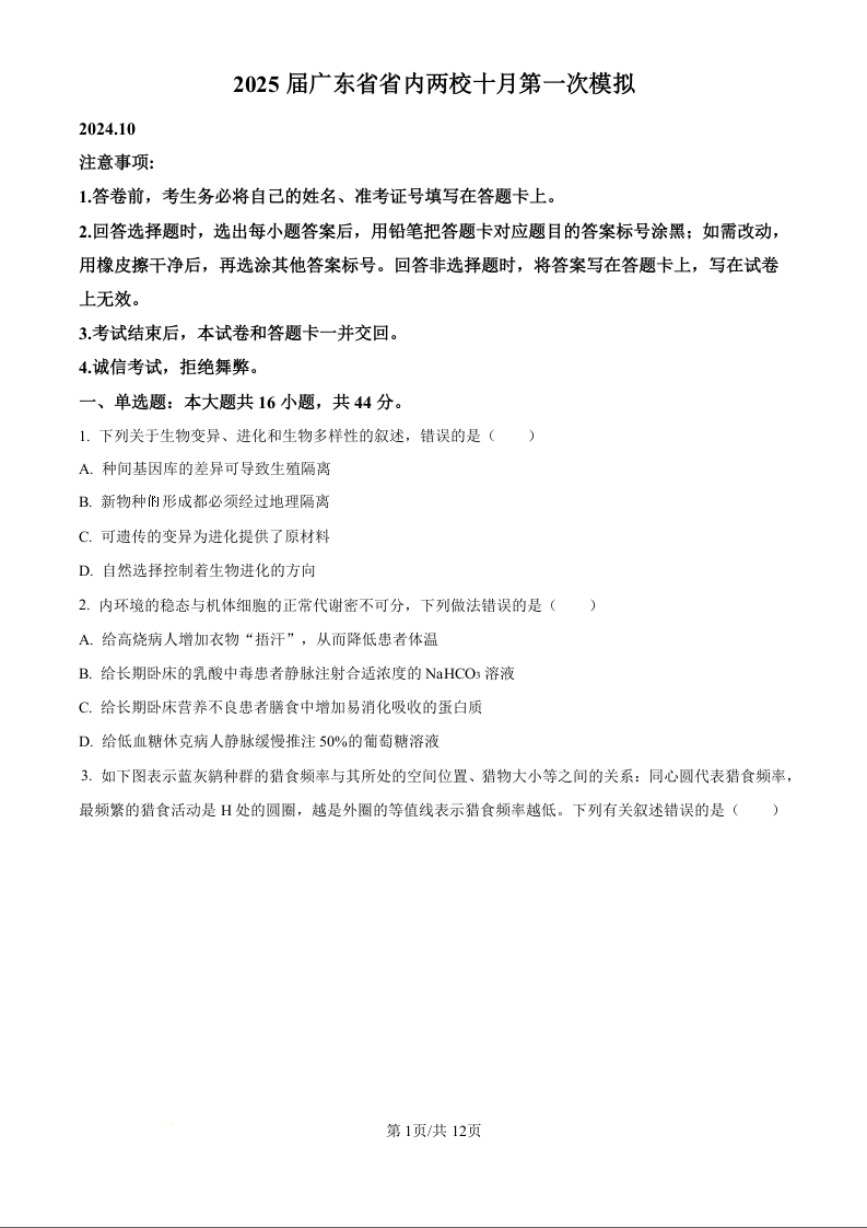 2025届广东省联考高三上学期10月第一次模拟(一模)生物
