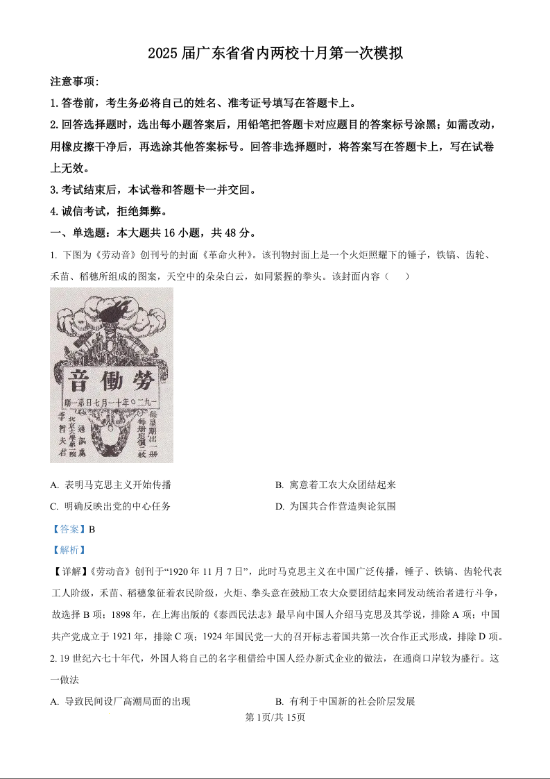 2025届广东省联考高三上学期10月第一次模拟(一模)历史答案
