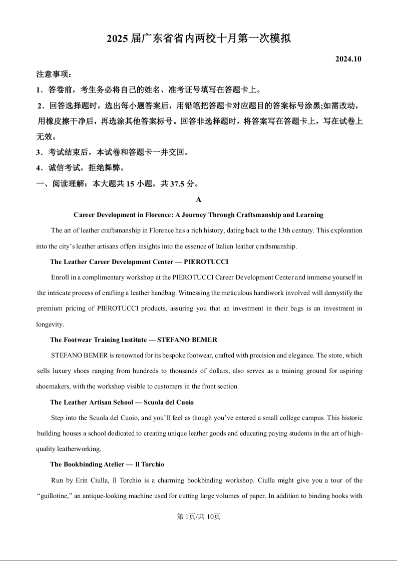 2025届广东省联考高三上学期10月第一次模拟(一模)英语