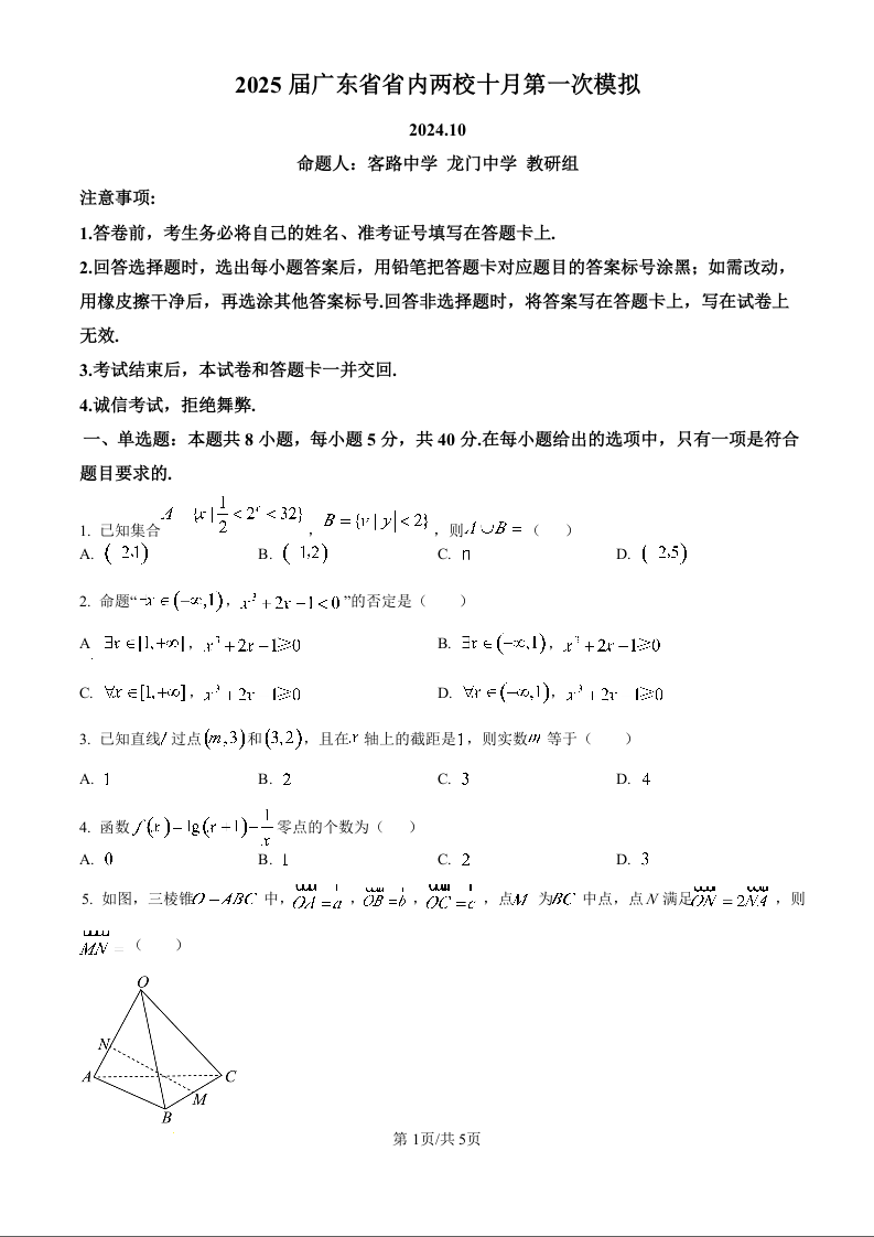 2025届广东省联考高三上学期10月第一次模拟(一模)数学