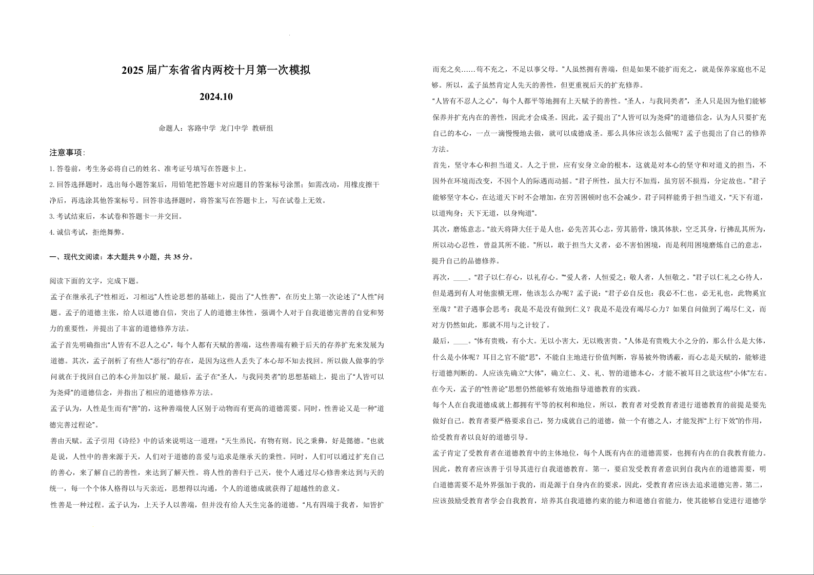 2025届广东省联考高三上学期10月第一次模拟(一模)语文