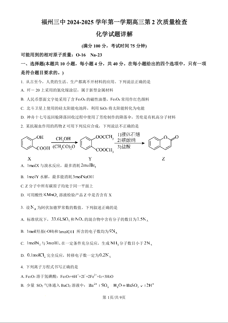 福州三中2024-2025学年第一学期高三第二次质量检测 化学