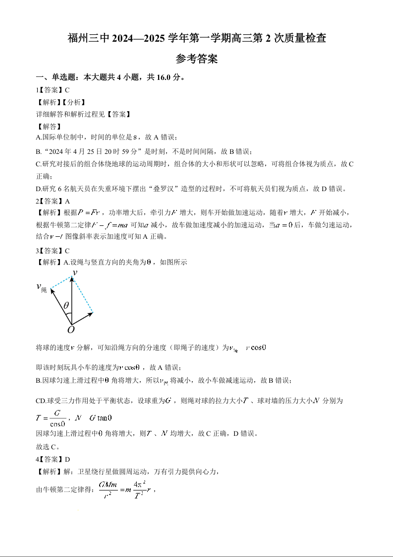 福州三中2024-2025学年第一学期高三第二次质量检测 物理答案