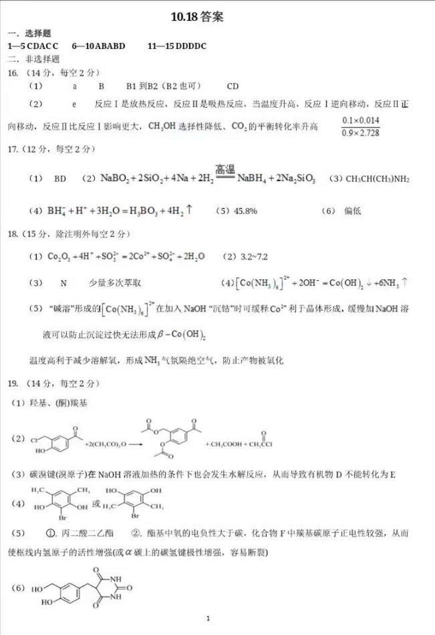 华中师大一附中2024-2025学年度十月月度检测 化学答案