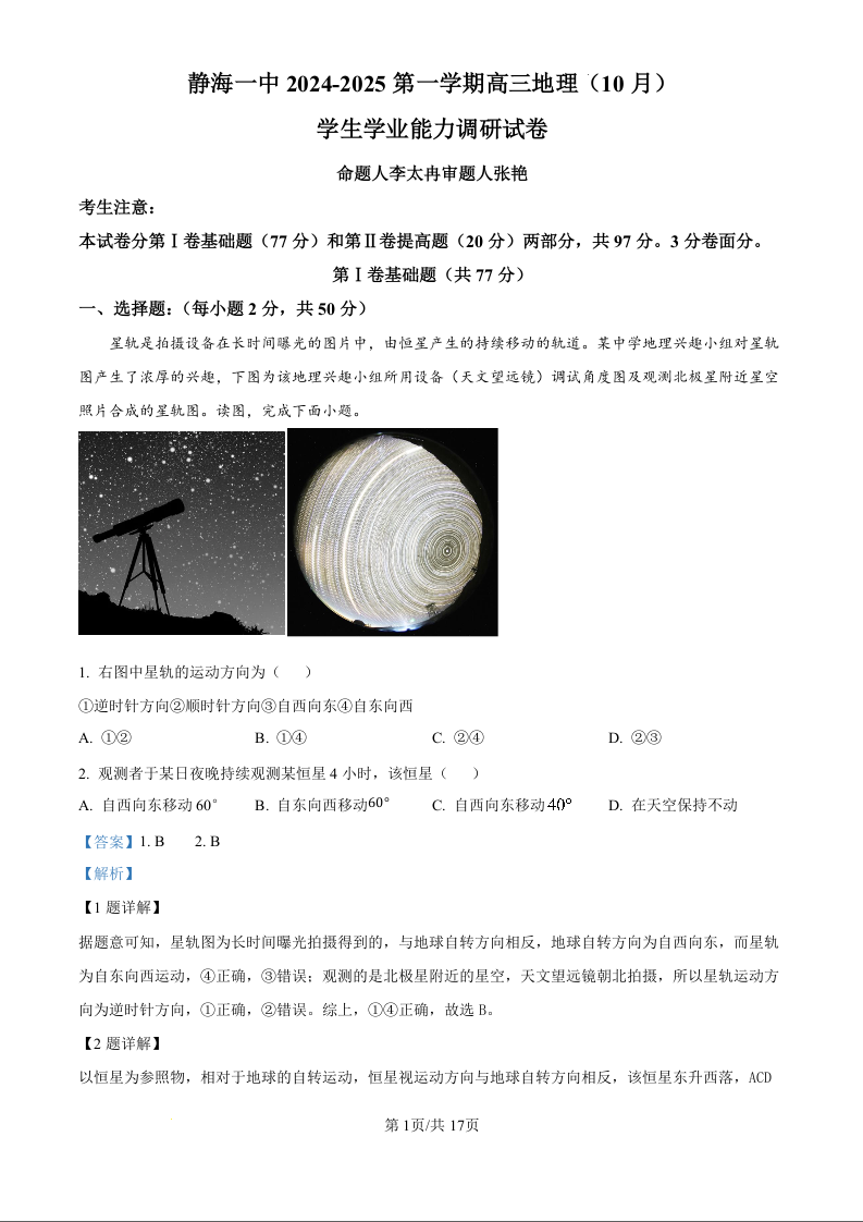 天津市静海区第一中学2025届高三上学期10月月考 地理答案