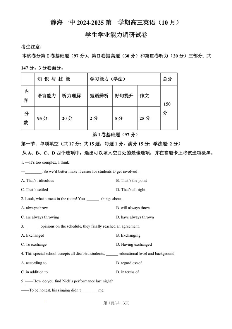 天津市静海区第一中学2025届高三上学期10月月考 英语