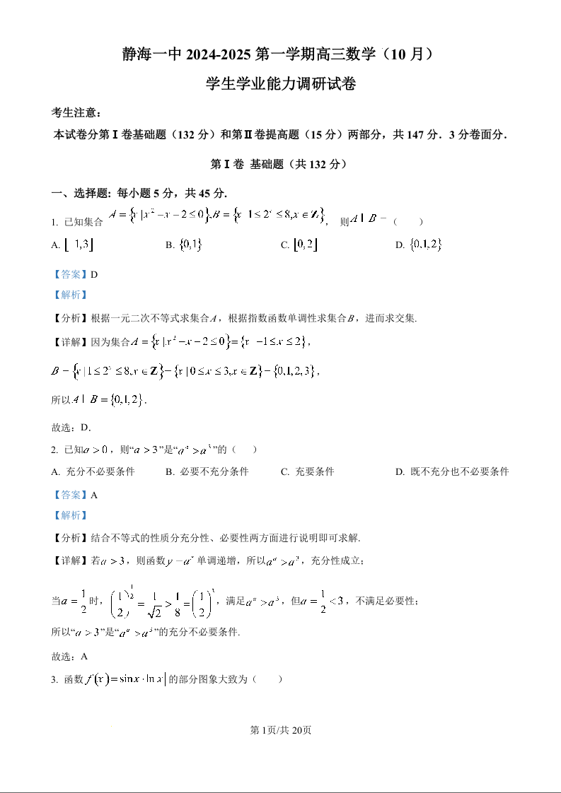 天津市静海区第一中学2025届高三上学期10月月考 数学答案