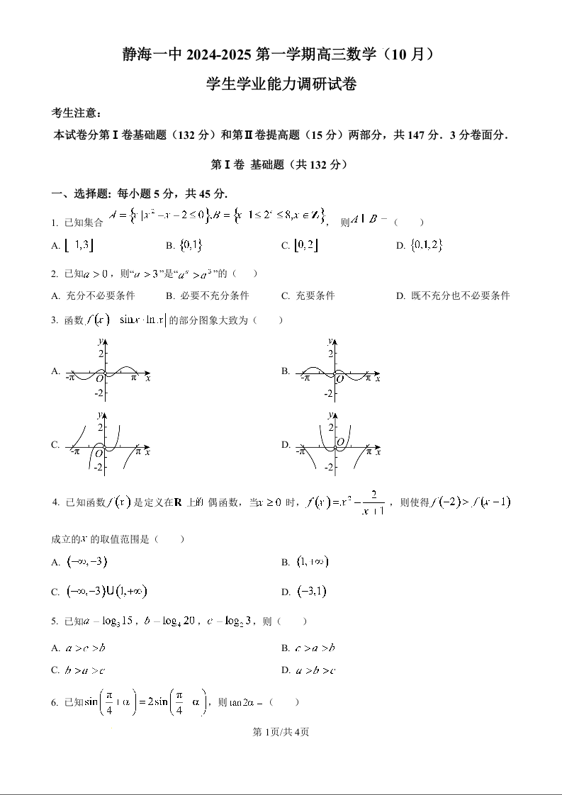 天津市静海区第一中学2025届高三上学期10月月考 数学