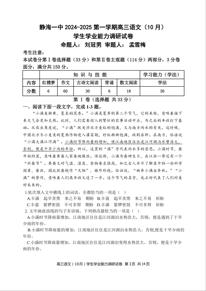 天津市静海区第一中学2025届高三上学期10月月考 语文