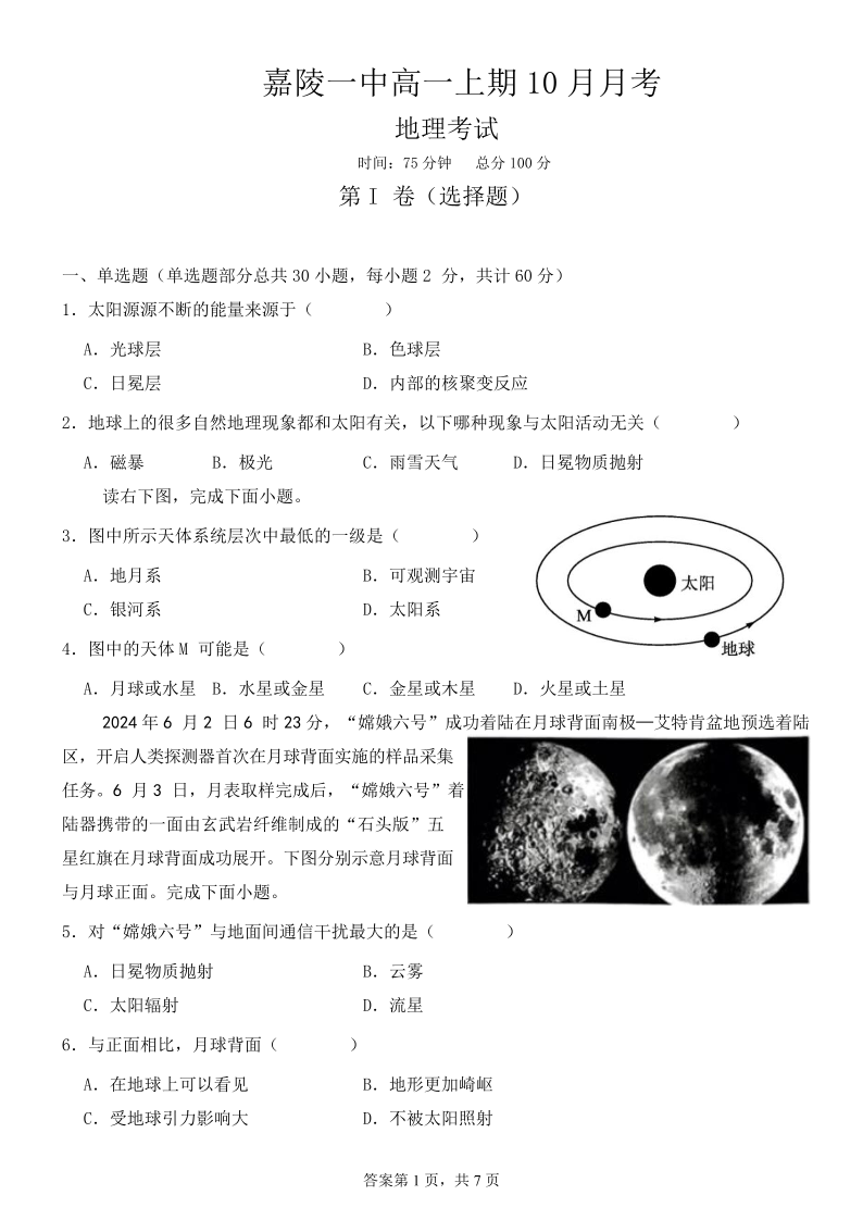 嘉陵一中高2024级高一上期第一次月考 地理