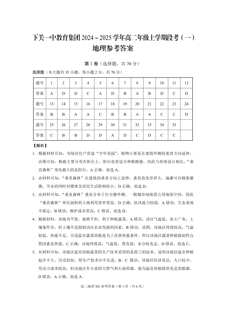 下关一中教育集团2024~2025学年高二年级上学期段考(一)地理答案