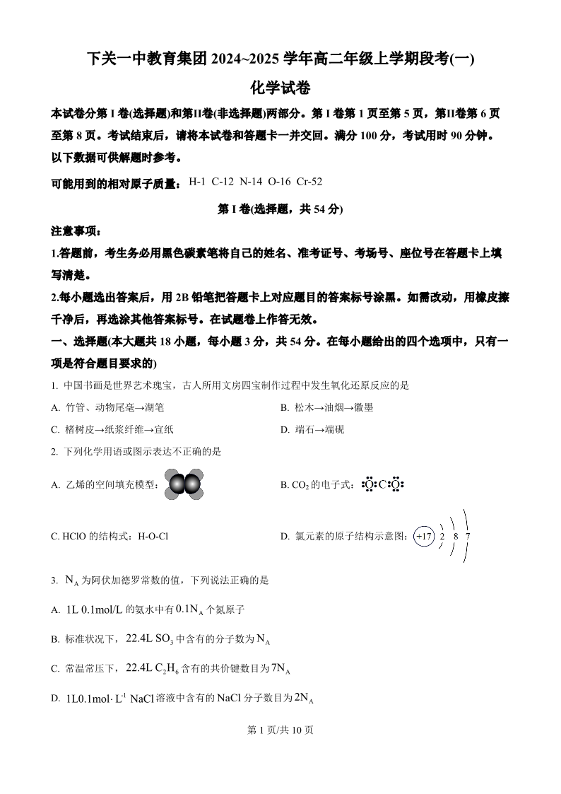下关一中教育集团2024~2025学年高二年级上学期段考(一)化学