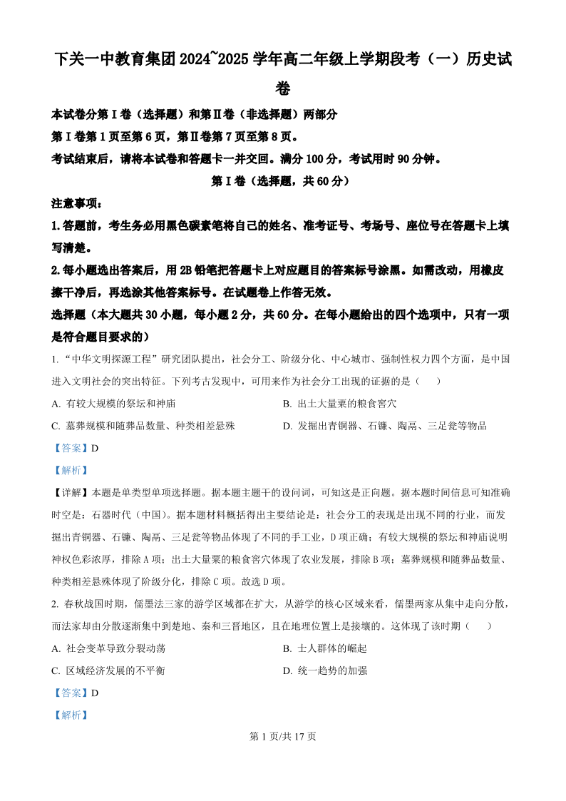 下关一中教育集团2024~2025学年高二年级上学期段考(一)历史答案