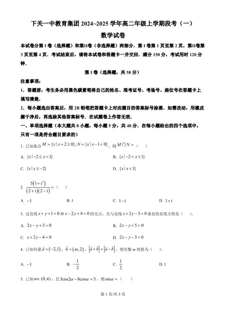 下关一中教育集团2024~2025学年高二年级上学期段考(一)数学
