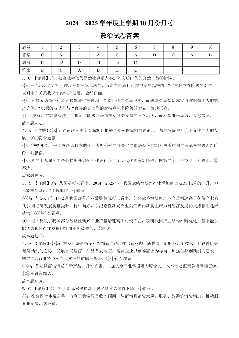 沈阳市重点学校高三上学期10月月考 政治答案