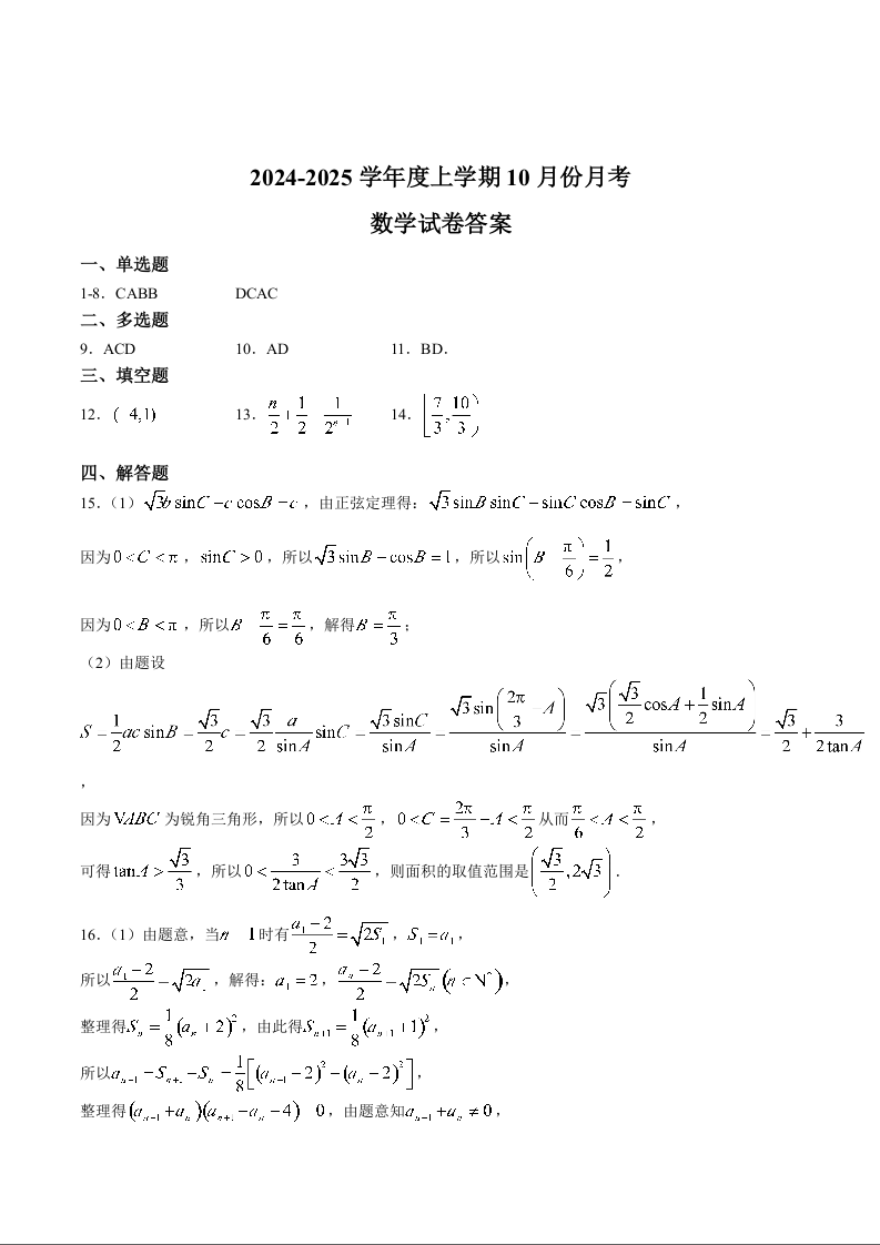 沈阳市重点学校高三上学期10月月考 数学答案