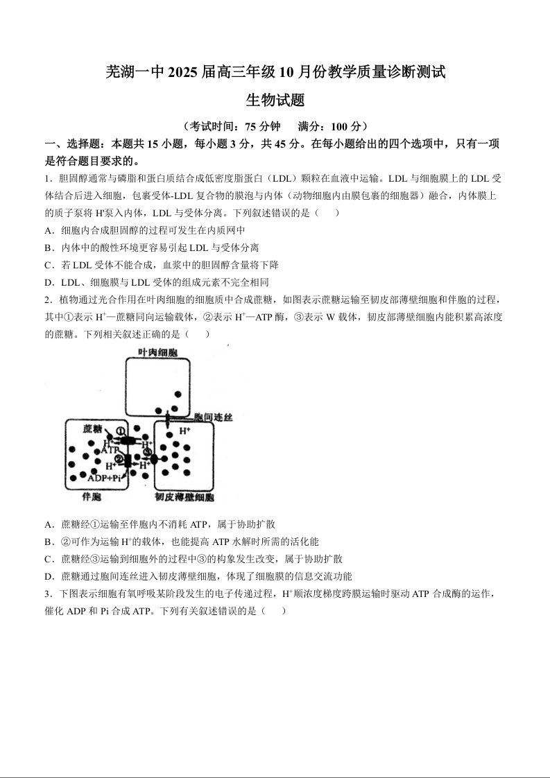 芜湖市第一中学2024-2025 学年高三上学期10月份教学质量诊断测试 生物