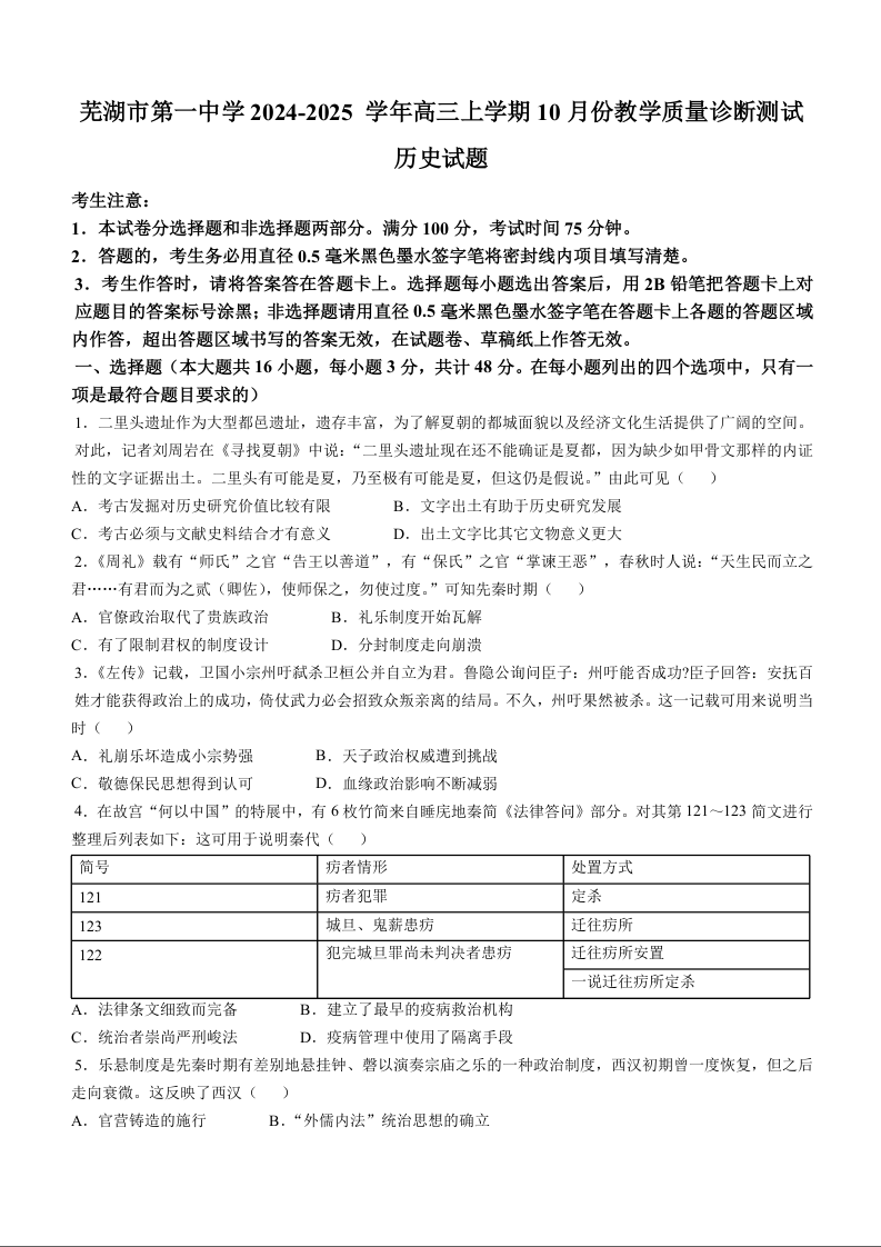 芜湖市第一中学2024-2025 学年高三上学期10月份教学质量诊断测试 历史