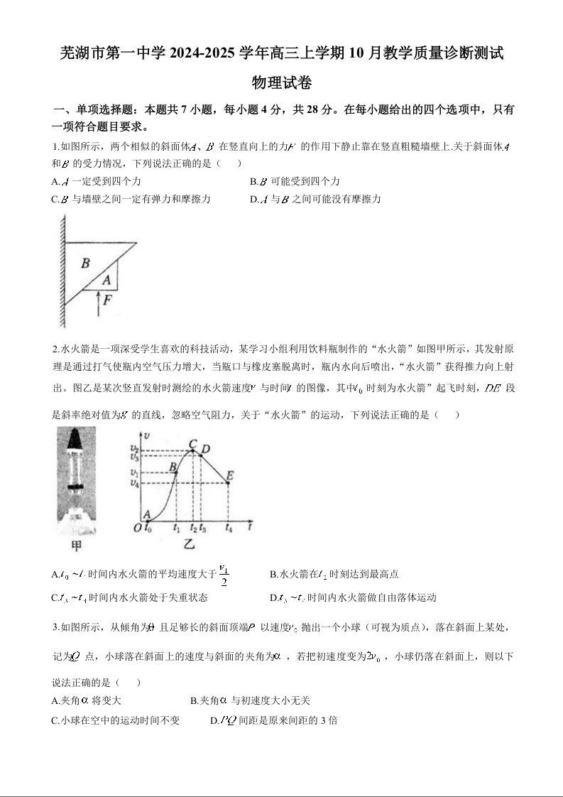 芜湖市第一中学2024-2025 学年高三上学期10月份教学质量诊断测试 物理