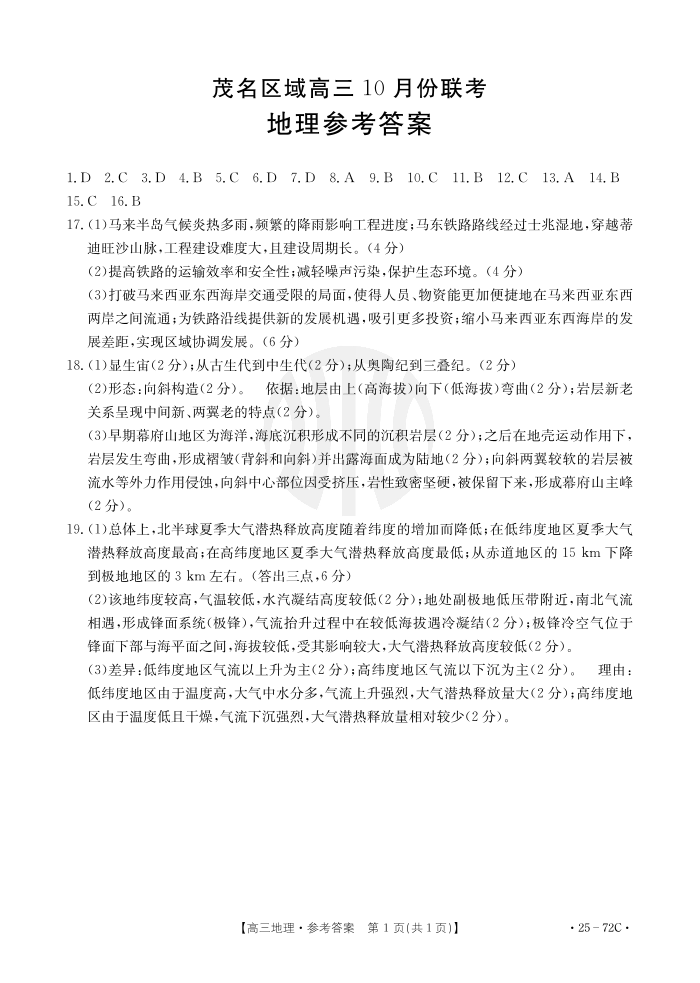 广东省茂名市2025届高三10月联考 地理答案
